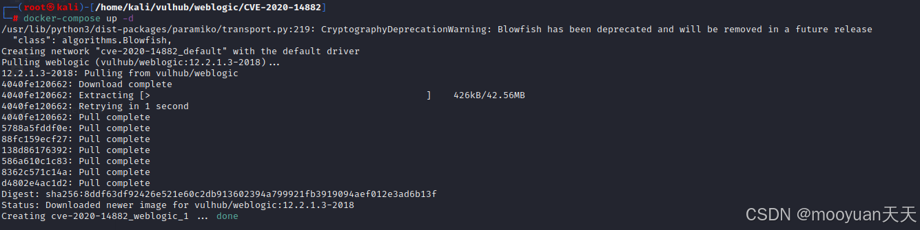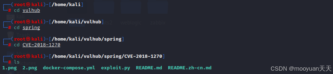 Vulhub 已经准备好现成的漏洞环境,我们只需进入对应目录。注意:docker需要管理员权限运行,故而注意需要切换到root执行后续的docker命令。