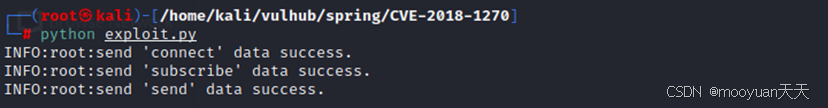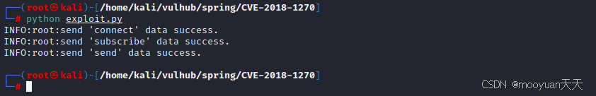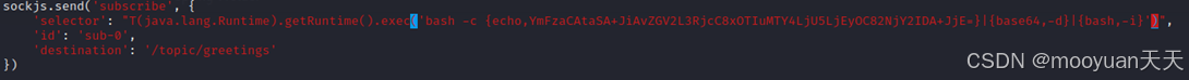 此脚本通过建立 WebSocket 连接并向存在漏洞的 Spring 服务器注入恶意的 SpEL 表达式,从而实现在目标系统上远程执行命令 (touch /tmp/mooyuan