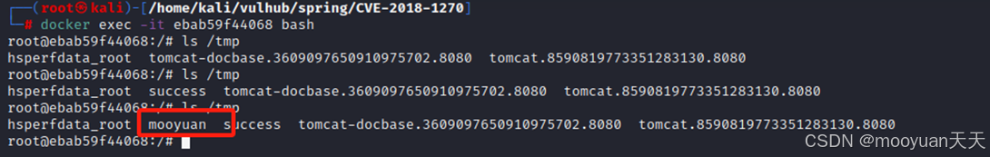 执行python exploit开启攻击,攻击后查看/tmp路径下的文件及子路径,如下所示在/tmp路径下成功创建了mooyuan文件,命令执行成功!