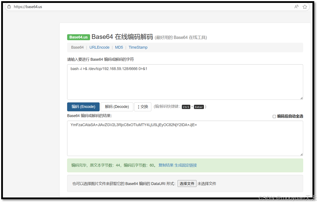 对命令进行base64编码,使用在线网址https://base64.us/ 即可,编码后内容如下所示。
