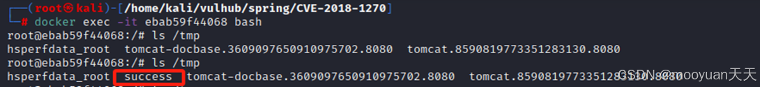 (创建一个名为 success的文件作为攻击成功的证明)。可以通过修改命令实现不同的攻击,如果想改为创建/tmp/mooyuan文件,需要修改exec中的命令内容,修改如下: