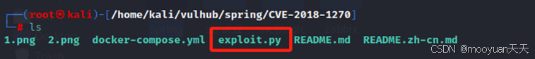 使用 docker ps 命令确认容器启动状态,说明由Vulhub 项目提供的Spring漏洞镜像容器已正常运行 ,通过宿主机器的8080 端口可访问容器内的Spring框架,可用于测试CVE-2018-1270漏洞的利用。