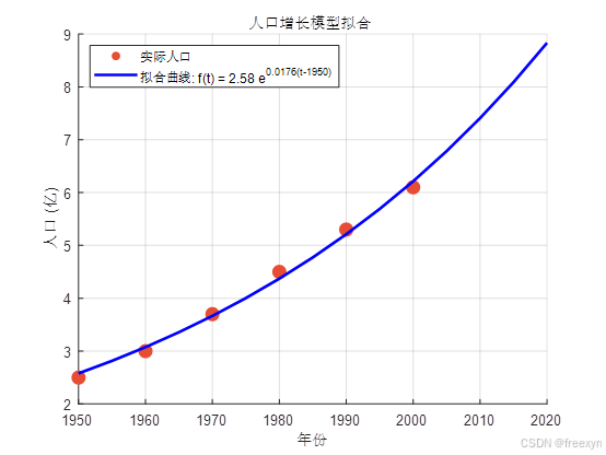 legend('实际人口', sprintf('拟合曲线: f(t) = %.2f e^{%.4f(t-1950)}',...
