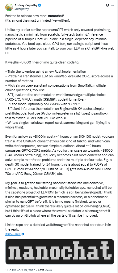 在 Karpathy 的 X 帖子中,他以较为轻松/夸张的口吻介绍了 nanochat(例如“Excited to release new repo: nanochat! (it's among the most unhinged I've written).”),并强调这是一个可在低成本上体验端到端 LLM 流程的项目(即 “the best ChatGPT that $100 can buy” 的定位)。