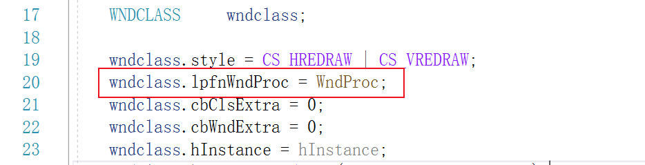 在本章程序代码里面,下图的红色框线所示的这一行,就是用来指定应用程序主窗口的窗口过程函数的。