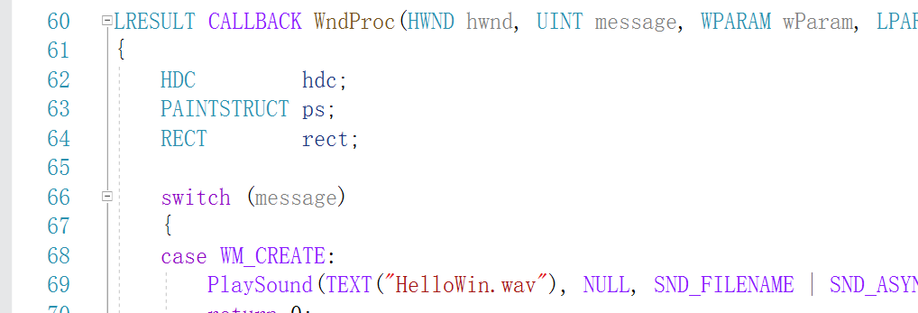 本章程序代码的 60 行开始的位置,便是本章程序中的窗口过程函数,如下图所示。