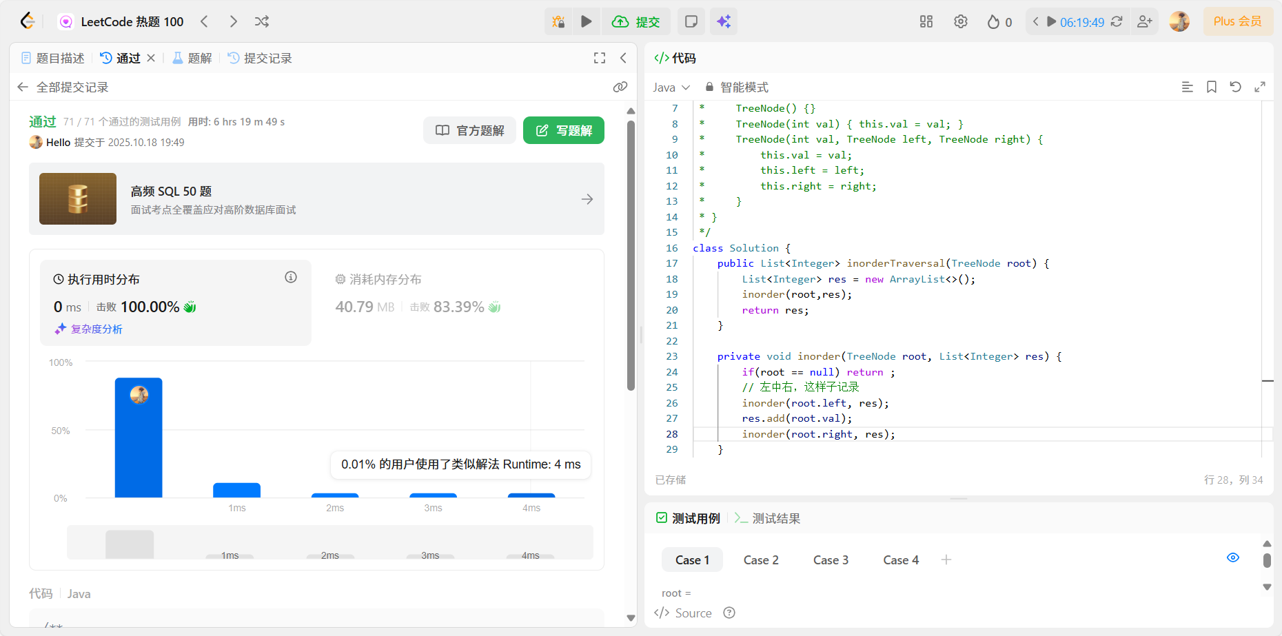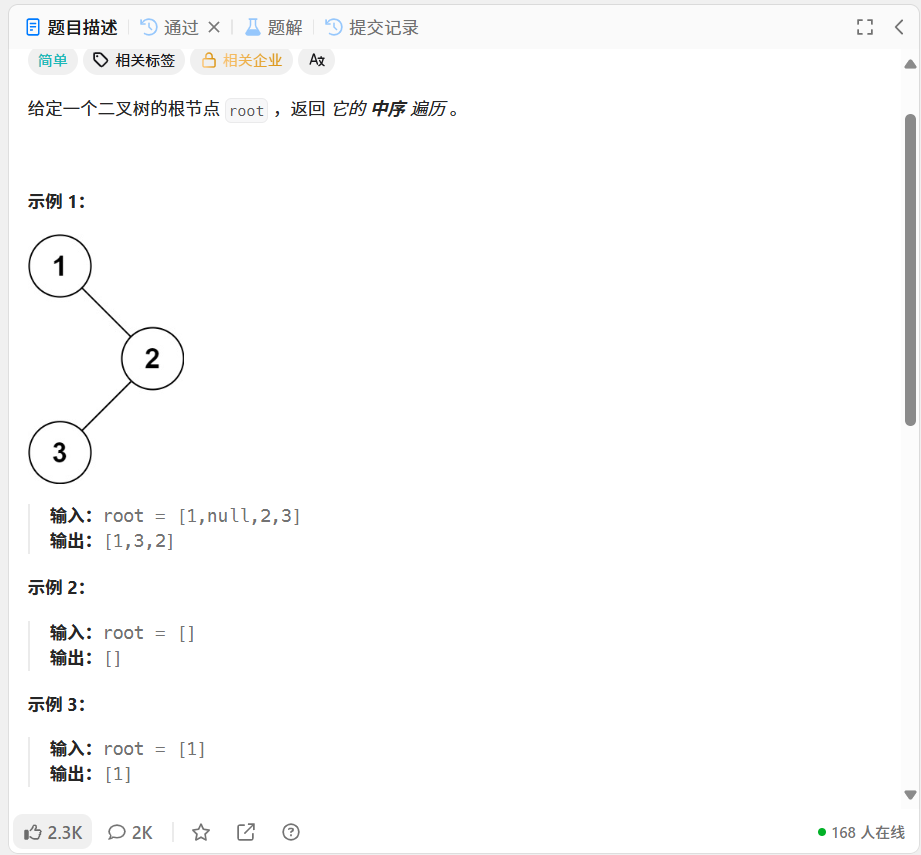 class Solution {public List<Integer> inorderTraversal(TreeNode root) {List<Integer> res = new ArrayList<>();inorder(root,res);return res;}private void inorder(TreeNode root, List<Integer> res) {if(root == null) return ;// 左中右,这样子记录inorder(root.left, res);res.add(root.val);inorder(root.right, res);}