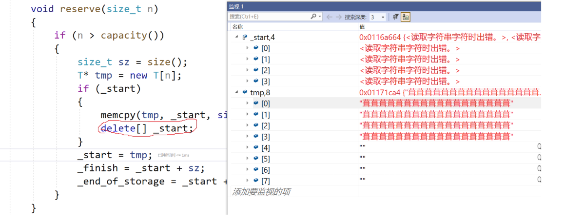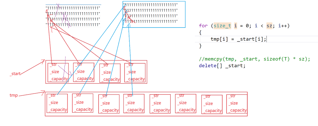 void reserve(size_t n){if (n > capacity()){size_t sz = size();T* tmp = new T[n];if (_start){for (size_t i = 0; i < sz; i++){tmp[i] = _start[i]; // 如果是string,调用string的赋值深拷贝}delete[] _start;}_start = tmp;_finish = _start + sz;_end_of_storage = _start + n;}}