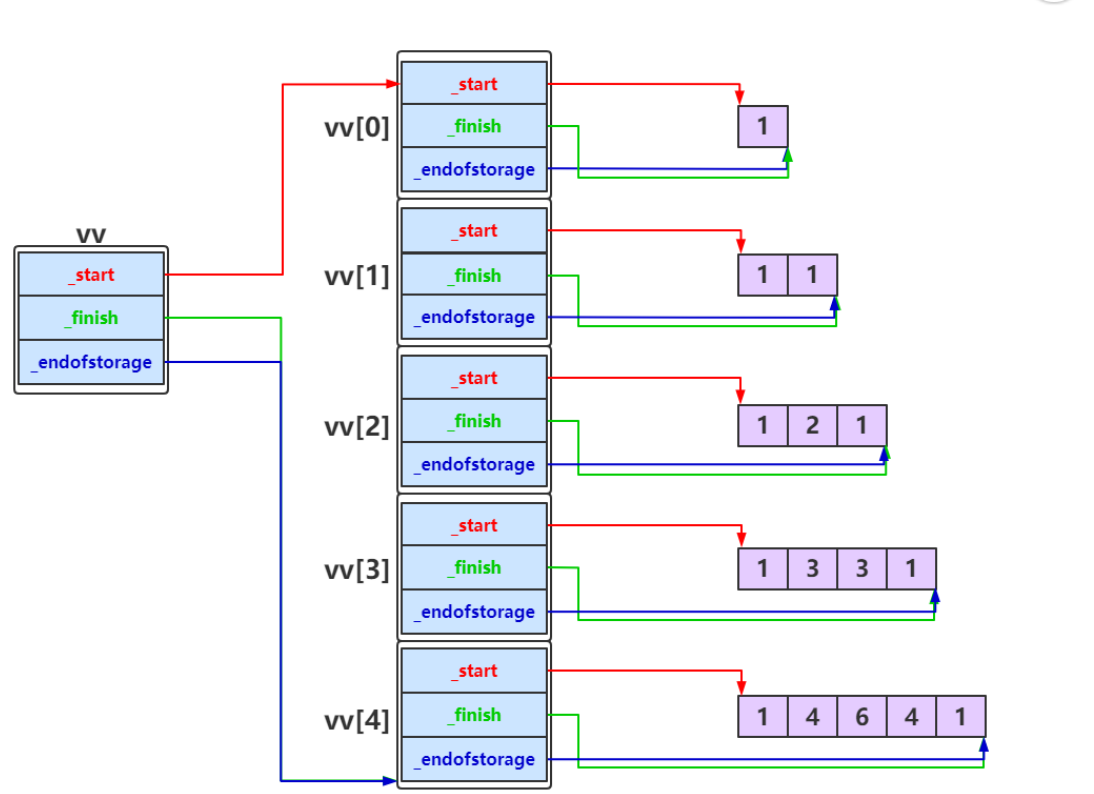 {// 使用vector定义二维数组vv,vv中的每个元素都是vector<int>bit::vector<bit::vector<int>> vv(n);// 将二维数组每一行中的vecotr<int>中的元素全部设置为1for (size_t i = 0; i < n; ++i)vv[i].resize(i + 1, 1);// 给杨慧三角出第一列和对角线的所有元素赋值for (int i = 2; i < n; ++i){for (int j = 1; j < i; ++j){vv[i][j] = vv[i - 1][j] + vv[i - 1][j - 1];}}