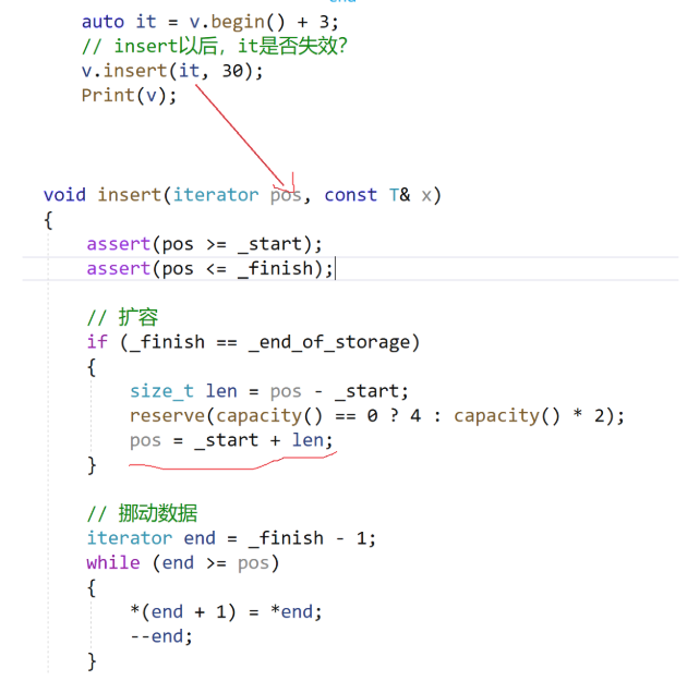 修改点:用len记录pos到_start的距离,扩容完后,重新确定pos的位置