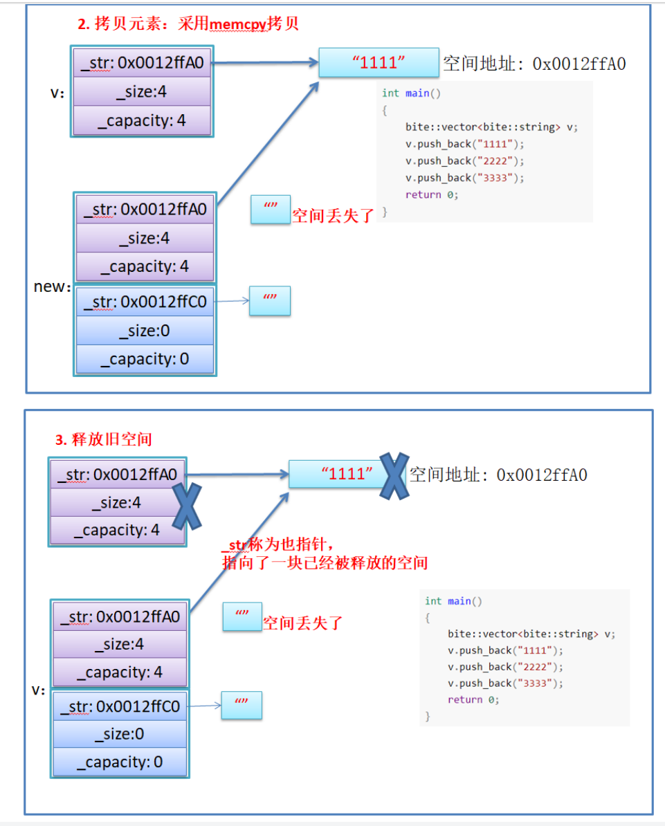 这个时候就会出错,因为memcpy是浅拷贝,如果有像string中含有指向其他地方的成员变量时,就会出错。