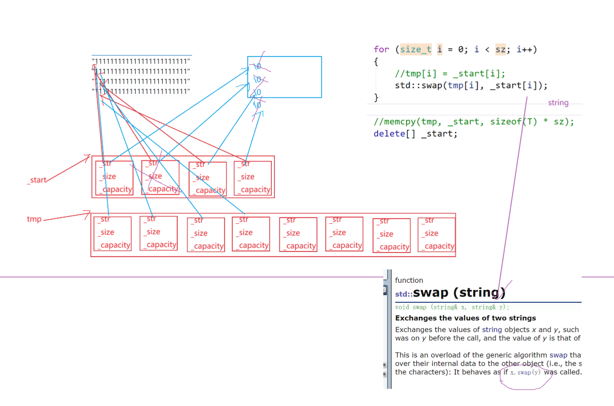 void reserve(size_t n){if (n > capacity()){size_t sz = size();T* tmp = new T[n];if (_start){for (size_t i = 0; i < sz; i++){std::swap(tmp[i], _start[i]); // 如果是string,调用string的交换,交换资源指向}delete[] _start;}_start = tmp;_finish = _start + sz;_end_of_storage = _start + n;}}