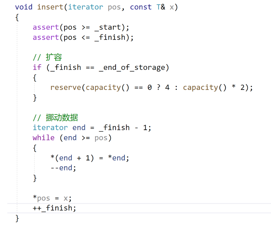 iterator insert(iterator pos, const T& x){assert(pos >= _start);assert(pos <= _finish);// if (_finish == _end_of_storage){size_t len = pos - _start;reserve(capacity() == 0 ? 4 : capacity() * 2);pos = _start + len;}// Ųiterator end = _finish - 1;while (end >= pos){*(end + 1) = *end;--end;}*pos = x;++_finish;return pos;}