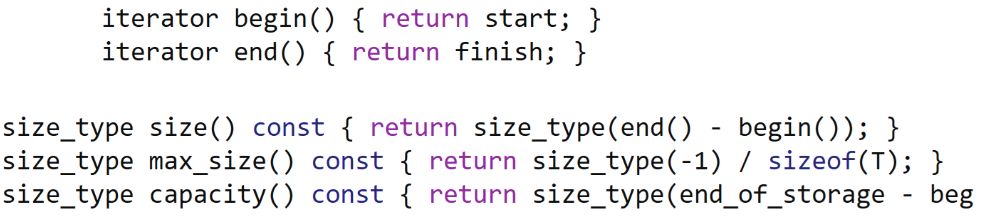 iterator begin(){return _start;}iterator end(){return _finish;}const_iterator begin() const{return _start;}const_iterator end() const{return _finish;}