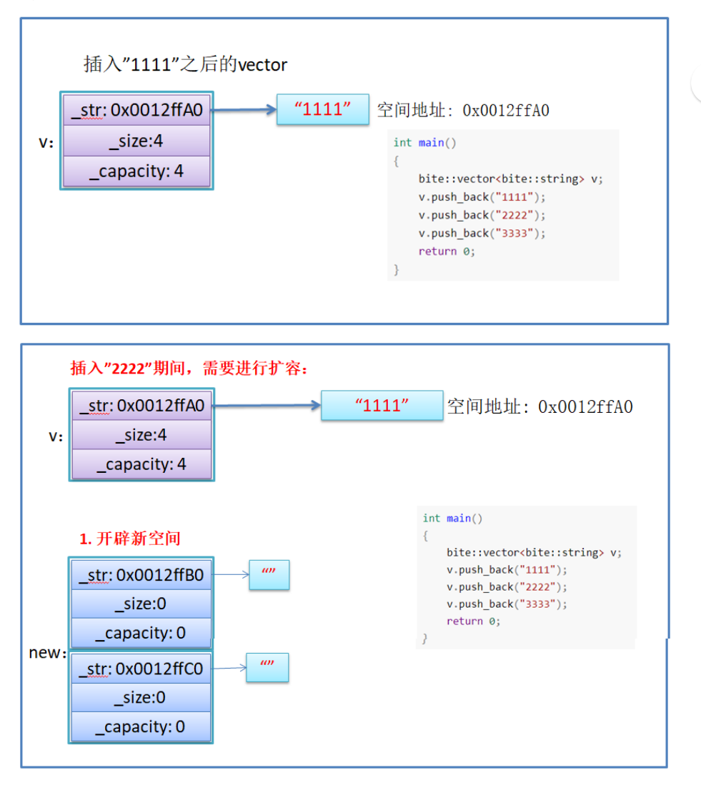 // 传统写法v2(v1)vector(const vector<T>& v){reserve(v.capacity());for (const auto& e : v){push_back(e);}}
