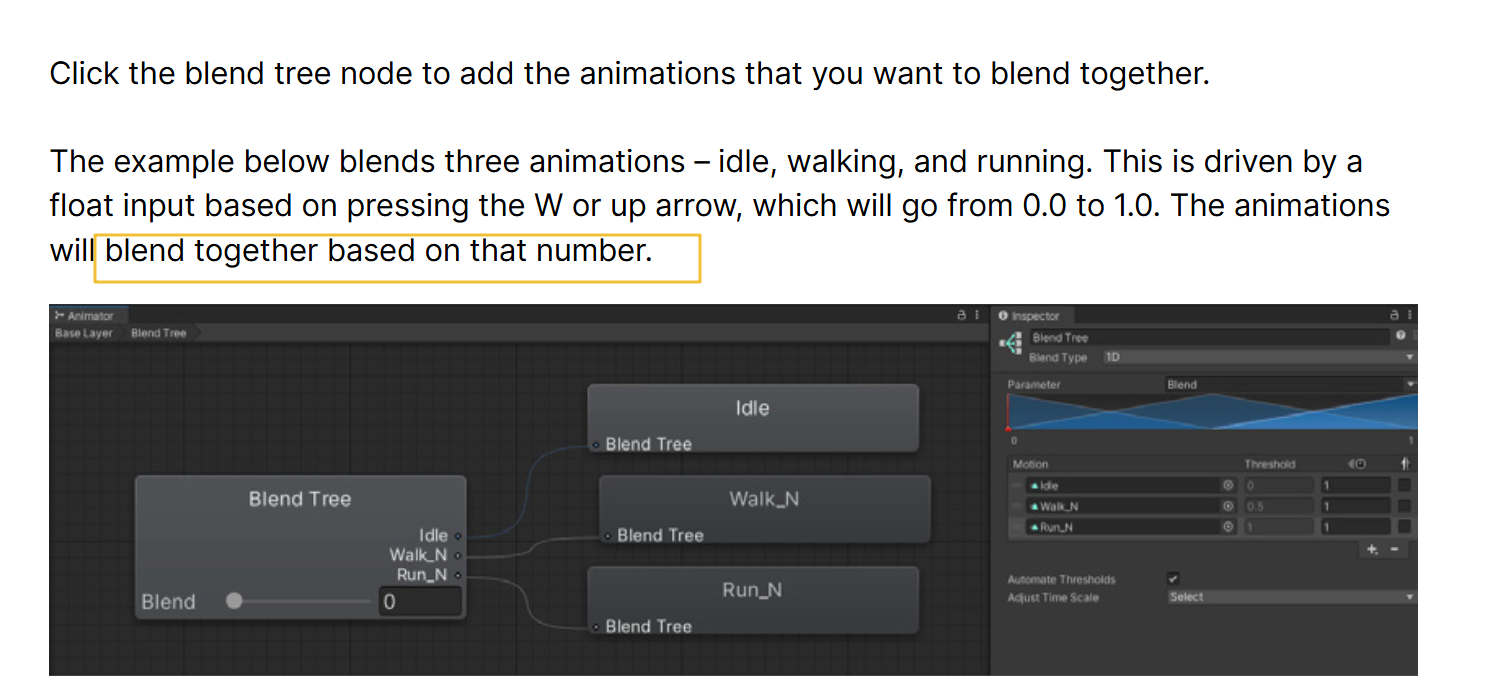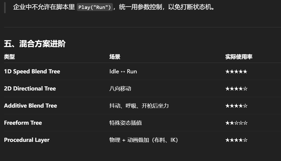 状态过渡(Clip Blend Tree):在“同一维度”的动作间插值(如速度变化)。