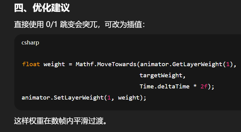 动作模糊过渡 | 在动画事件中缓慢插值权重实现平滑 blending |