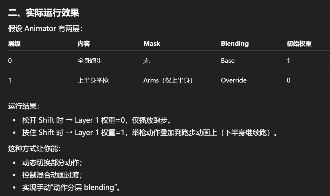 Layer 混合(Layer Weight):在“不同维度”的动作间叠加(如姿态叠加、表情、装备)