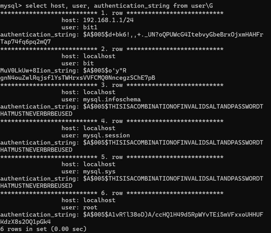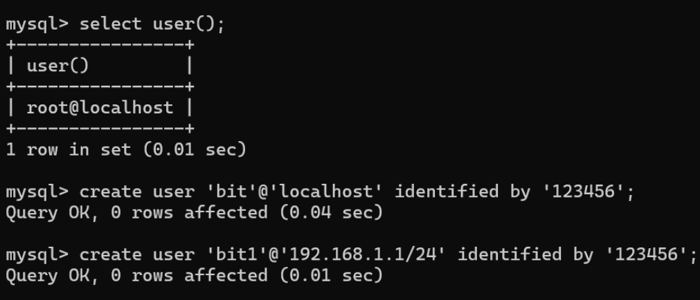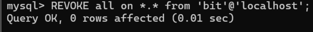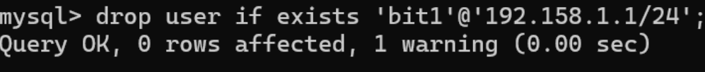 删除⽤⼾'bit1'@'192.168.1.1/24' mysql> drop user 'bit1'@'192.168.1.1/24';
