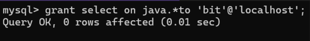 为bit@localhost⽤⼾授权于 java01 数据库的 select 权限