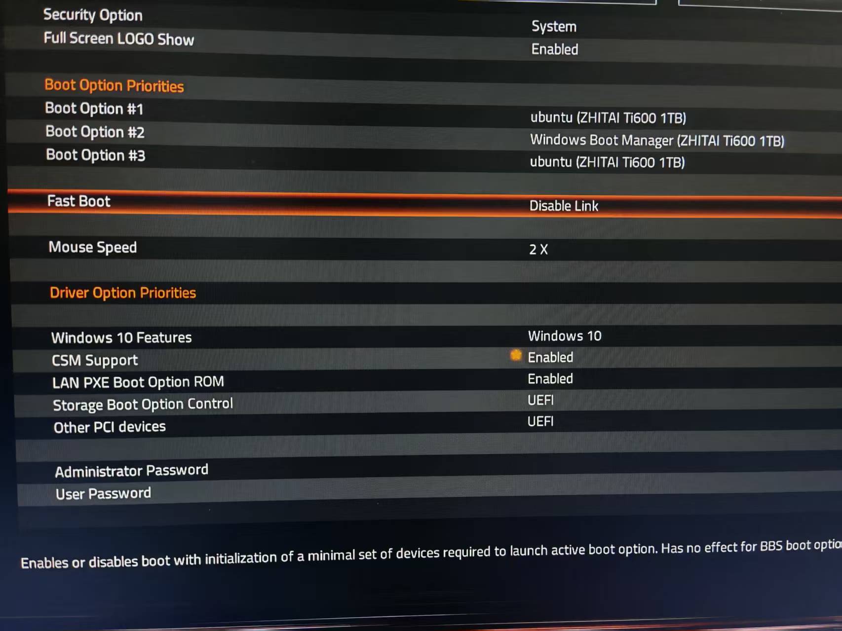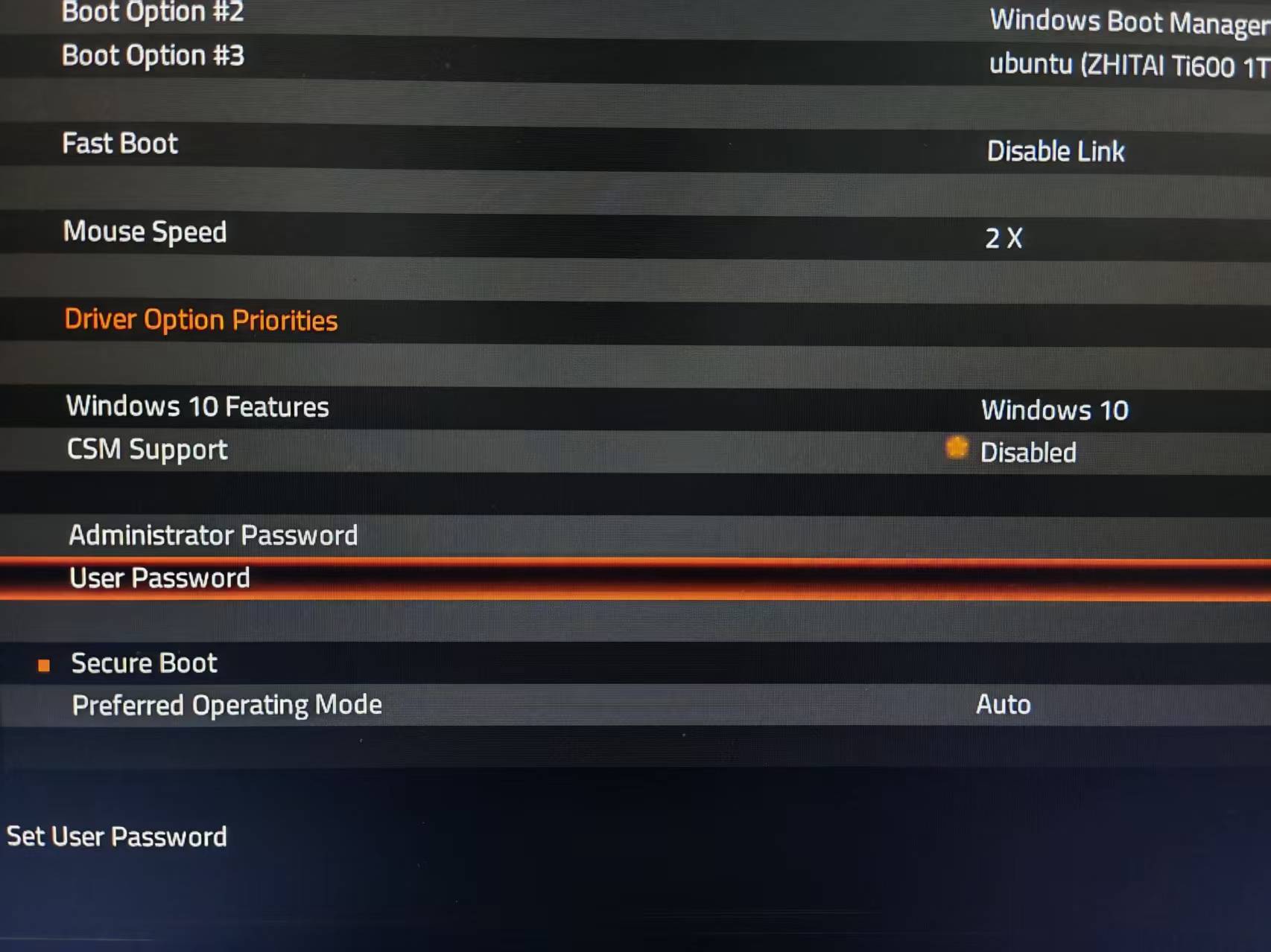 所以,要让 Secure Boot 选项出现,你必须先关闭 CSM Support。