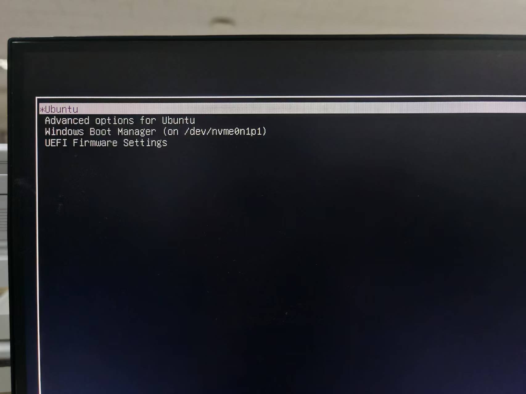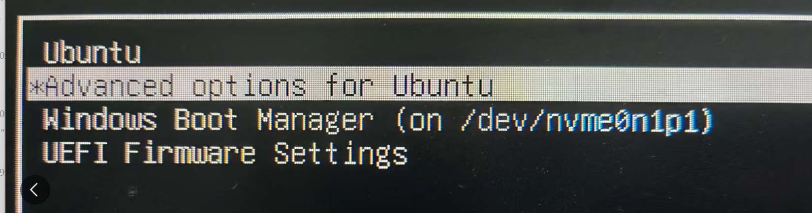 执行完以下流程后,重启电脑,==这里注意,重启的时候还是要进入bios界面,然后选择ubuntu系统启动==,然后这里注意,选择Advanced options for Ubuntu