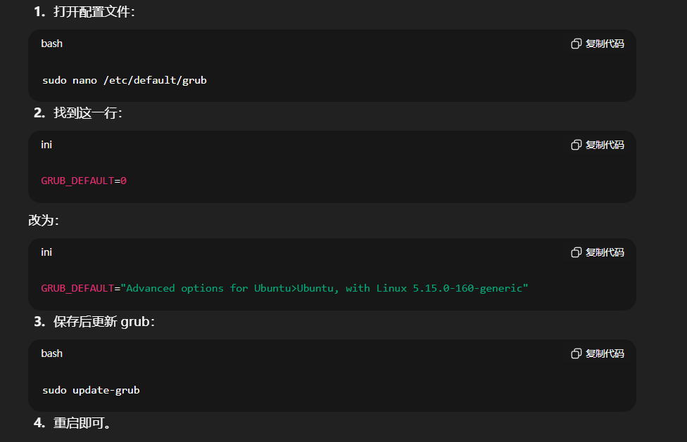 sudo apt update sudo apt install linux-image-generic # 这通常是指向 GA 内核的包 # 或者安装指定版本,例如 linux-image-5.15.0-XX-generic / linux-headers-5.15.0-XX-generic # 安装之后要更新 initramfs、更新 grub、选择默认启动项 sudo update-initramfs -u -k all sudo update-grub