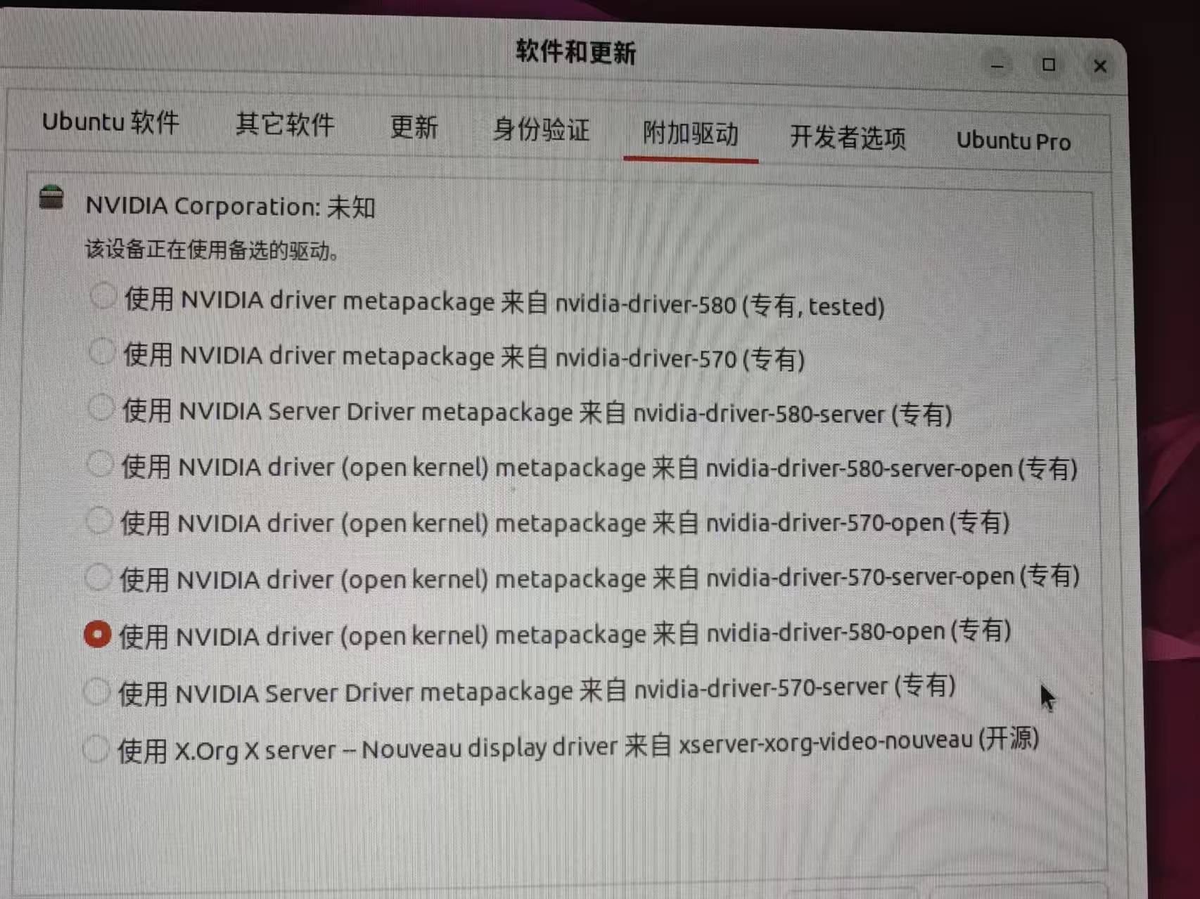 ==如果有同学直接安装以nvidia-driver-580-open(专有)结尾的这个版本,并且通过nvidia-smi命令检查也安装成功了,那么就不需要看后续内容了==