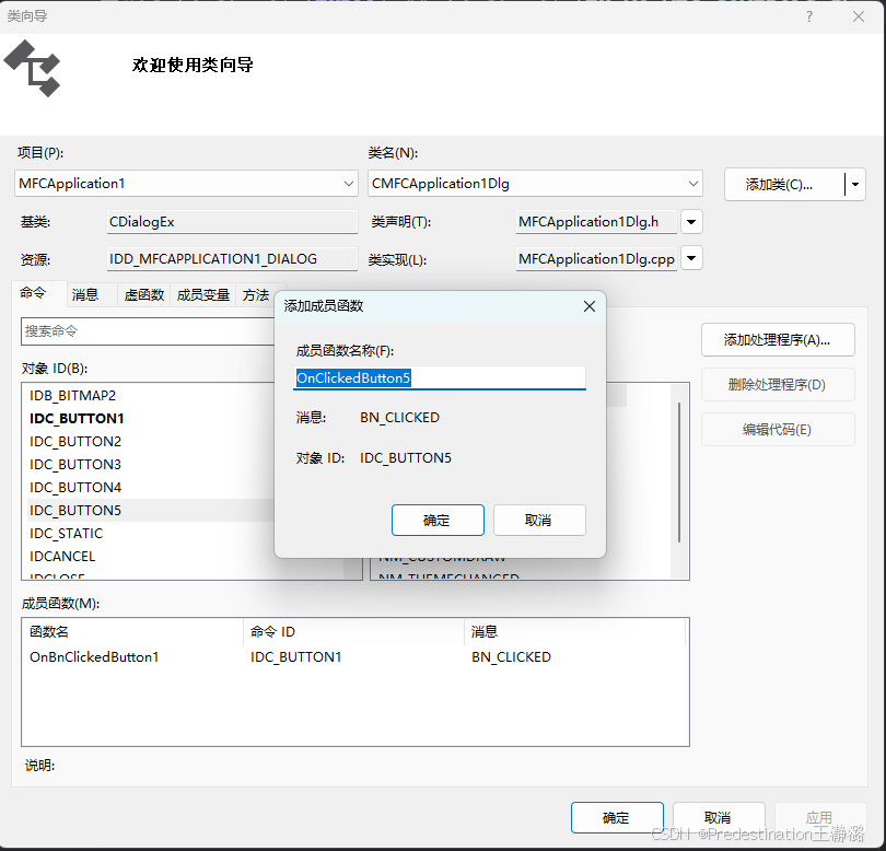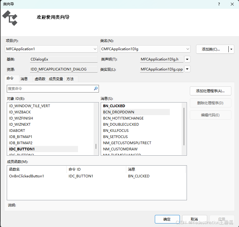 - 类向导中可以看到命令那一栏中有控件的ID,点击可以看到右侧可以实现的功能