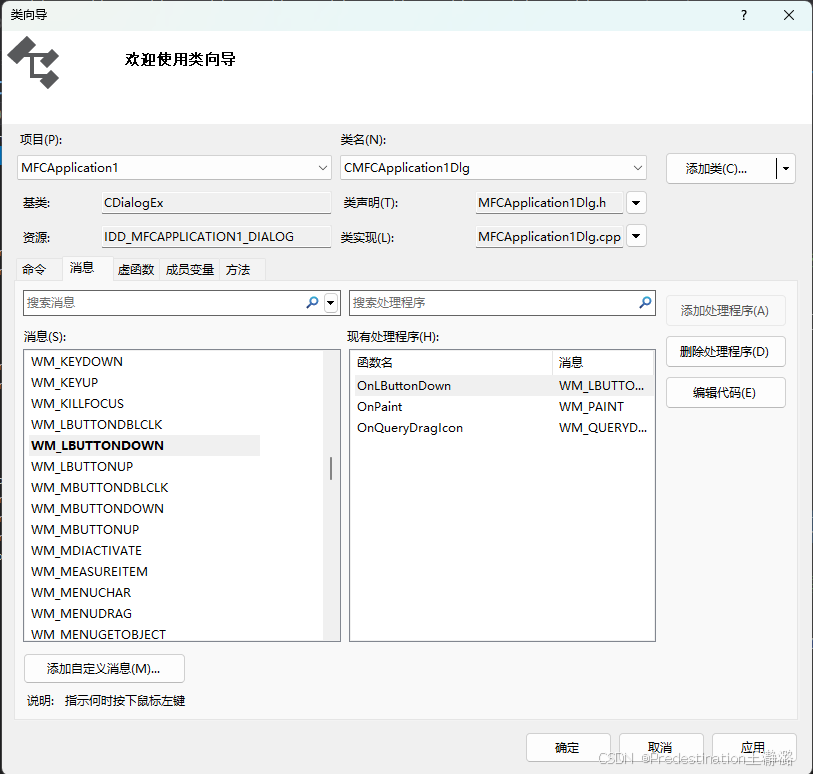 - 2.消息映射会多出一个声明:ON_WM_LBUTTONDOWN()