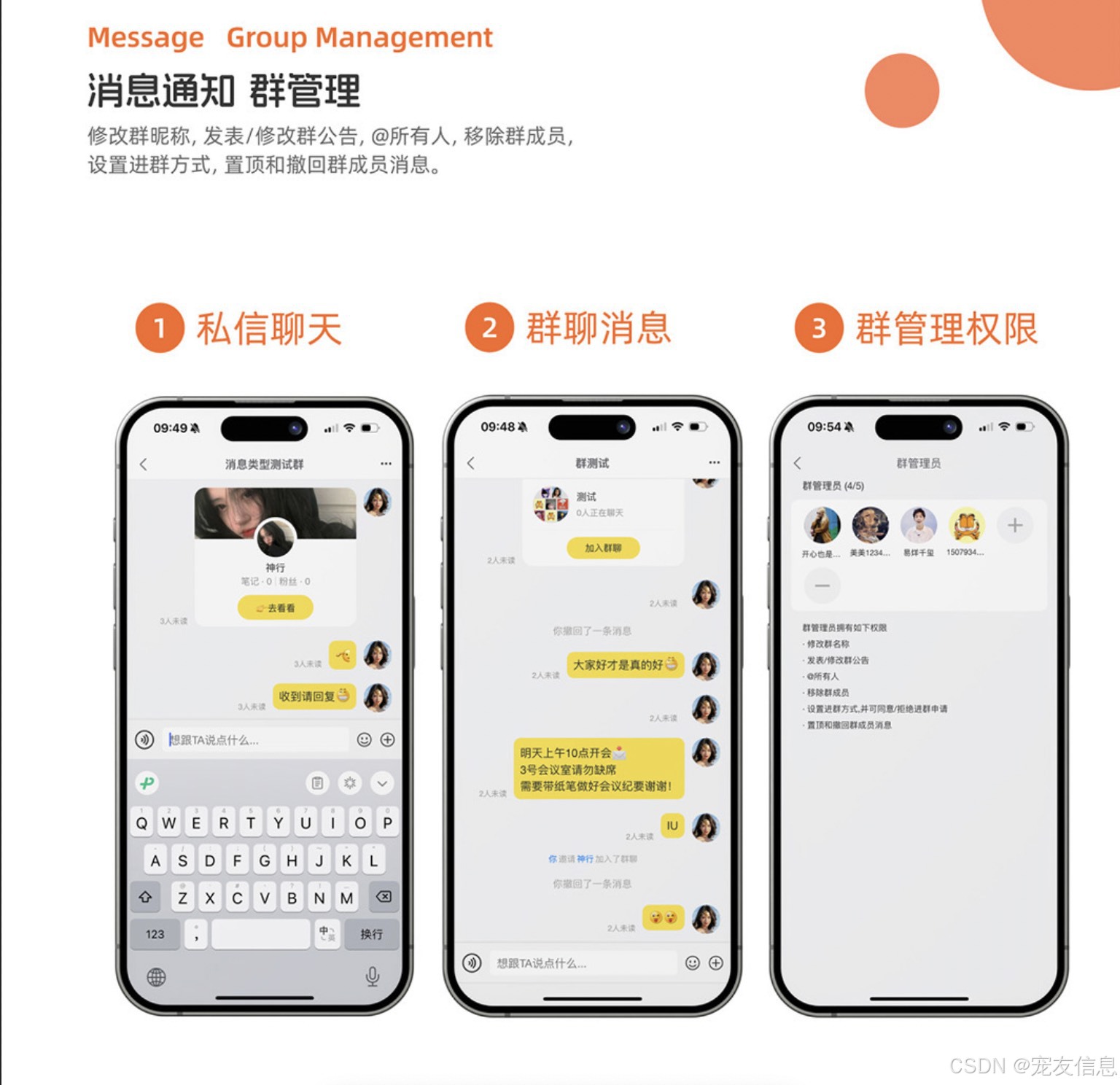 支持单聊与群聊,支持文字、语音、图片、视频、表情、红包等消息类型。