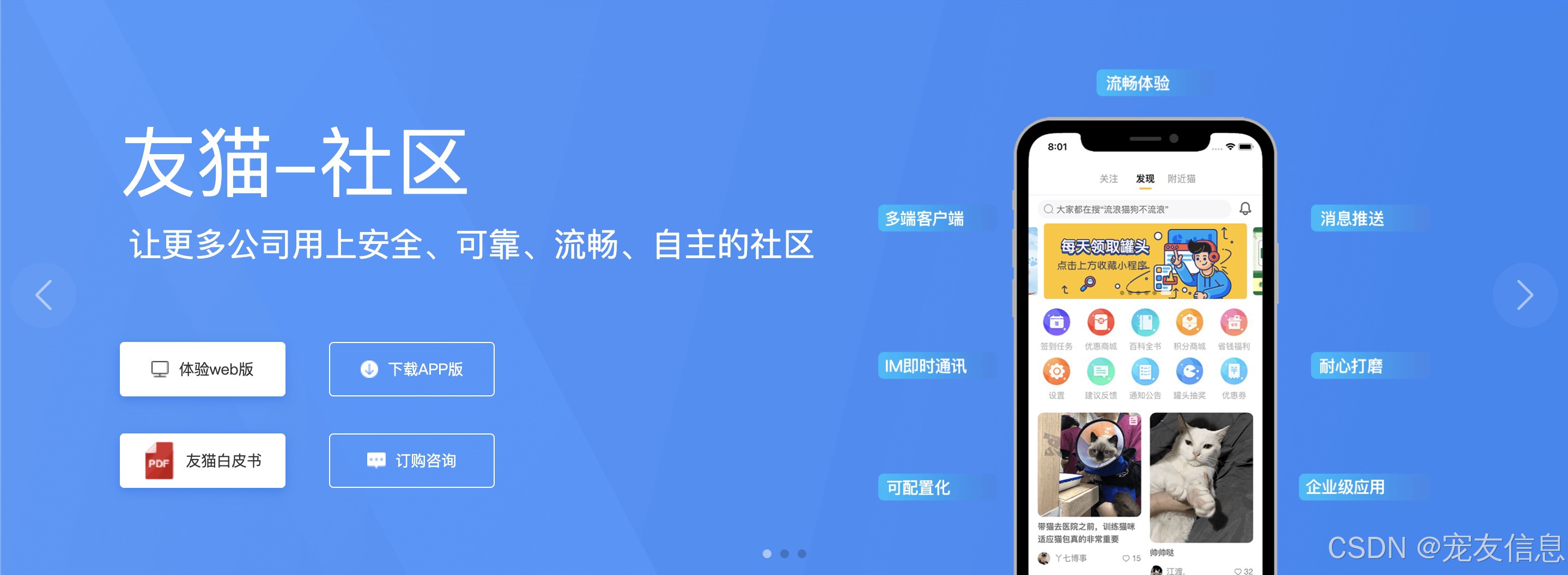友猫社区平台由宠友信息技术有限公司自主研发,是一套面向社区、社交、电商和即时通讯一体化的综合型系统。