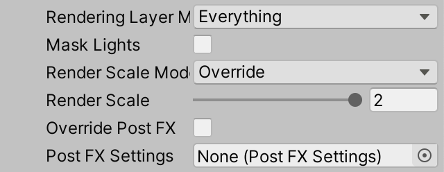 让我们也实现每个相机使用不同渲染缩放比例的功能。例如,某个相机可以始终以半分辨率或双分辨率进行渲染。这可以是固定的(覆盖RP的全局渲染缩放比例),也可以是叠加应用的(相对于全局渲染缩放比例)。