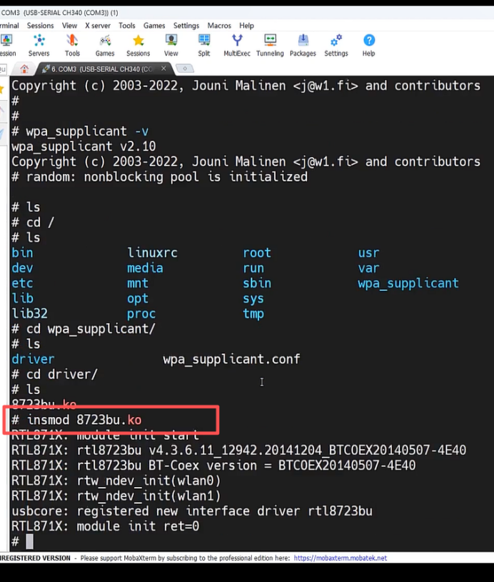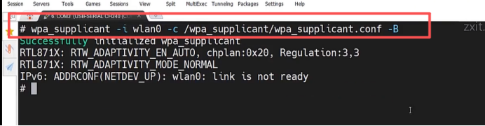 录解压测试。通过NFS形式挂载根文件系统,运行wpa_supplicant程序效果如下: