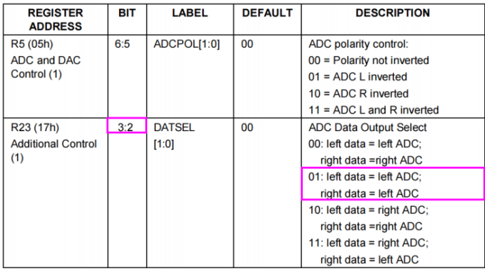 打开WM8960 的数据手册了,我们可以配置 WM8960 的右声道 ADC 直接使用左声道的数据。