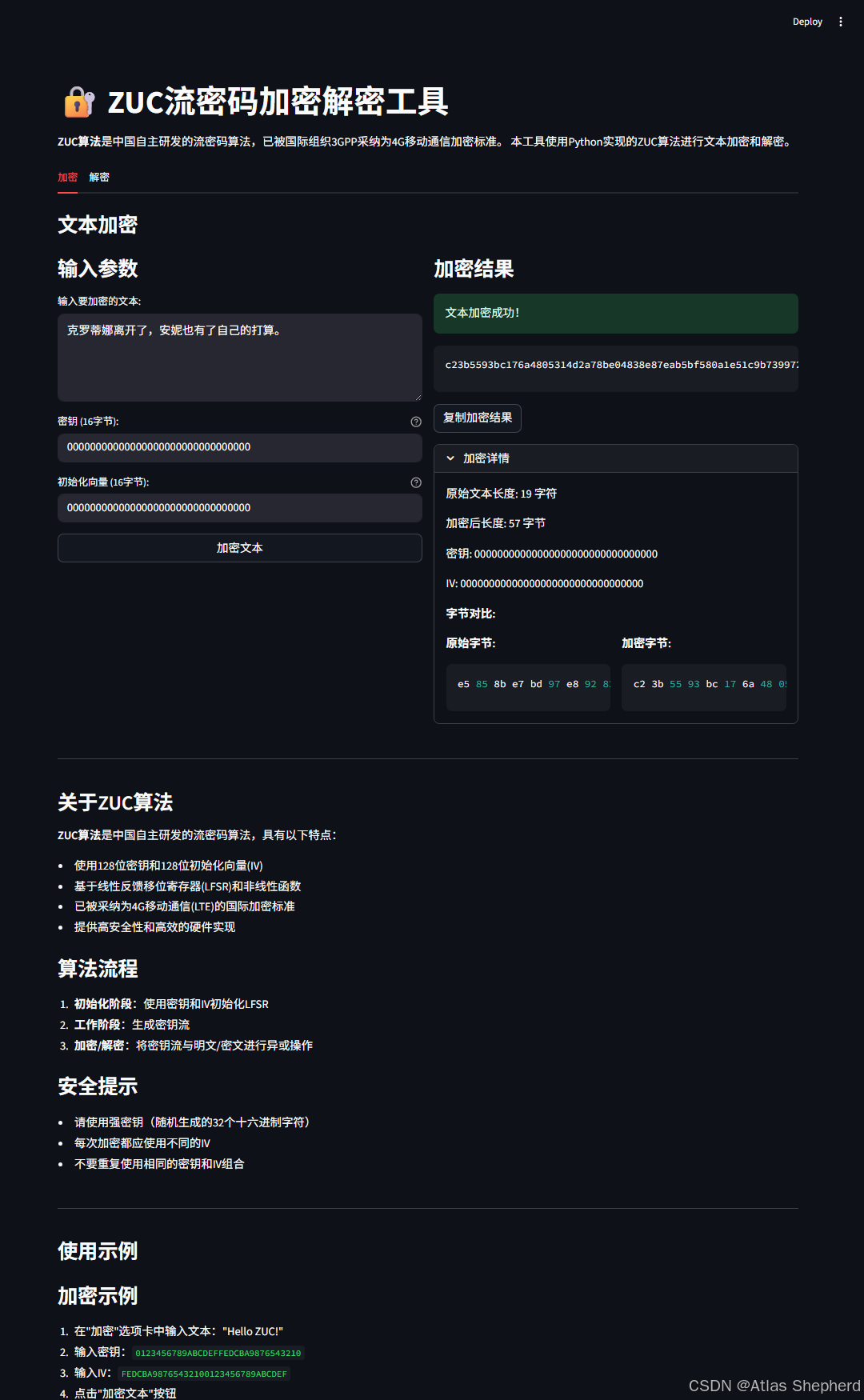 基于Python实现的ZUC流密码加密解密工具。ZUC是中国自主研发的流密码算法,已被采纳为4G移动通信加密标准。该工具通过Streamlit构建了用户友好的Web界面,提供文本加密和解密功能。核心功能包括:支持128位密钥和IV输入、UTF-8文本加密、十六进制格式结果显示、加密详情展示和字节对比。文章详细说明了ZUC算法的实现要点,包括S盒置换、线性变换函数和密钥流生成过程。工具还包含算法说明、安全提示和使用示例,帮助用户正确使用该加密工具。该实现严格遵循ZUC算法规范,为保护数据安全提供了便捷的解决方案。