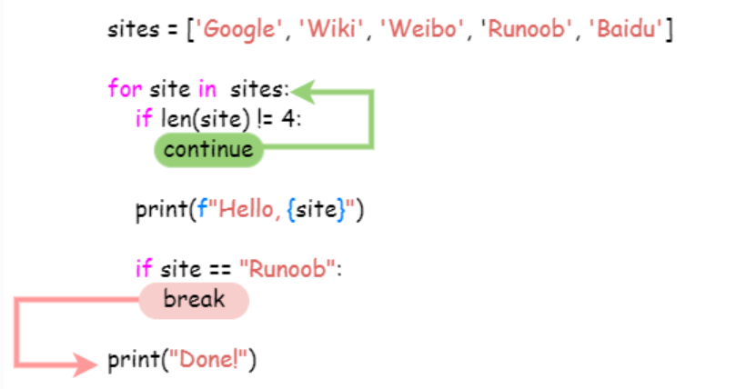 break 语句可以跳出 for 和 while 的循环体。如果你从 for 或 while 循环中终止,任何对应的循环 else 块将不执行。