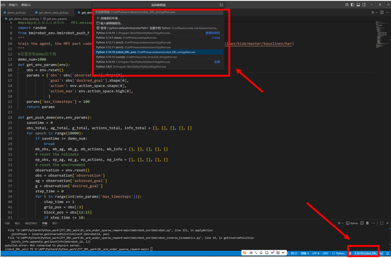 在vscode打开项目,点击右下角的按钮,然后会出现上面的方框,这就是你所有的虚拟环境,选择对应的虚拟环境就好了。