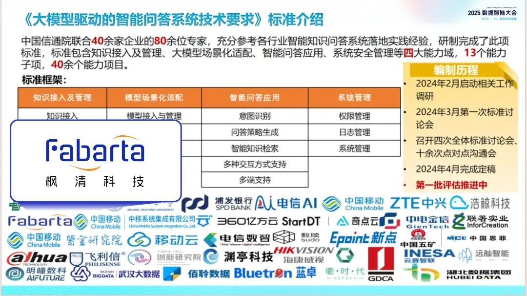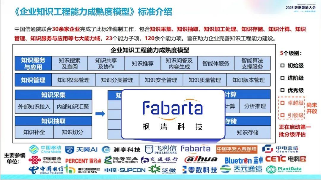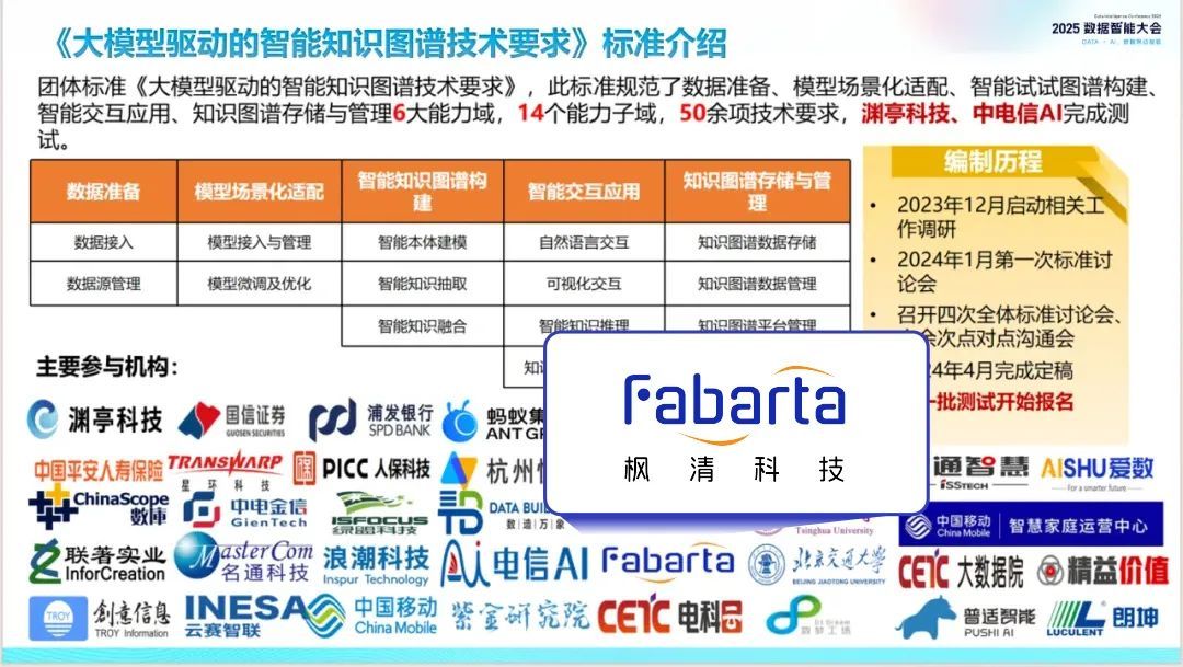 枫清科技(Fabarta)作为该指南的编委会成员机构,参与了问卷反馈及现场调研环节,以及《企业知识工程能力成熟度模型》《大模型驱动的智能知识图谱技术要求》《大模型驱动的智能问答系统技术要求》等标准的编制。