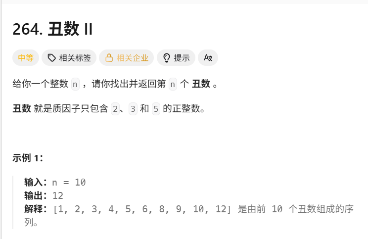前几个丑数是 1, 2, 3, 4, 5, 6, 8, 9, 10, 12, ...