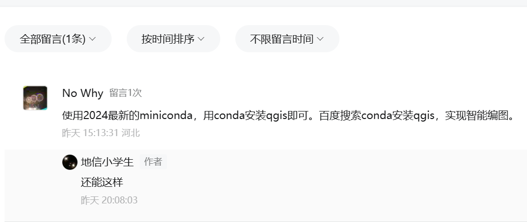 前几天分享了如何在PyCharm中调用PyQGIS等,分享后有人留言,说使用conda安装QGIS后可以更加方便。我去搜索了一下,使用conda安装qgis确实有一些方便之处:conda*会自动解决 QGIS 的依赖问题,包括 GDAL、PyQt 等复杂依赖,确保安装的组件版本兼容,减少手动配置的麻烦;也能更好的进行环境的隔离,通过虚拟环境来避免冲突。