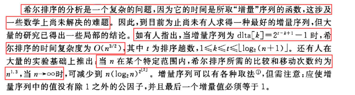 希尔排序时间复杂度不好计算,因为 gap 的取值很多,导致很难去计算,因此很多书中给出的希尔排序的时间复杂度都不固定。《数据结构(C语言版)》--- 严蔚敏书中给出的时间复杂度为: