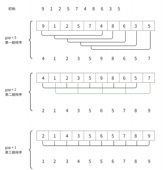 将数组中间隔为gap的元素分在同一组,形成多个子序列。