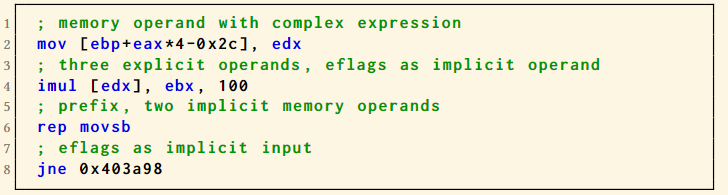 部分指令具有隐式操作数。算术指令会隐式改变EFLAGS寄存器,而条件跳转指令则将EFLAGS作为隐式输入。优质的指令级表示必须理解每条指令的这些内部细节。