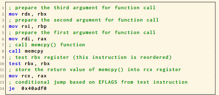 尽管这一假设通常成立,但编译器优化往往会打破该假设以实现指令级并行性的最大化。具体而言,编译器优化旨在通过将寄存器或内存位置的加载操作与其最后一次存储操作间隔更远,并在其间插入不相关指令,来避免指令执行流水线的停顿。清单2提供了一个示例:第10行的test指令与其周围的call和mov指令并无关联。该test指令(其结果将存入EFLAGS)被编译器移至mov指令之前,使其与第14行使用(加载)该EFLAGS的je指令距离更远。由此可见,由于编译器优化的影响,控制流上的上下文关系可能包含噪声。
