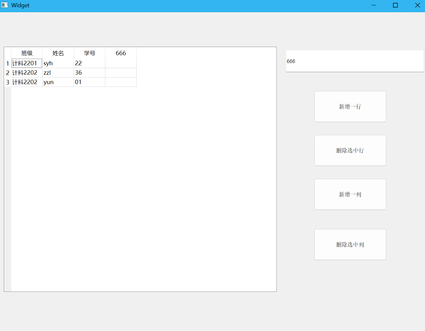 {ui->setupUi(this);// 新增行ui->tableWidget->insertRow(0);ui->tableWidget->insertRow(1);ui->tableWidget->insertRow(2);// 新增列ui->tableWidget->insertColumn(0);ui->tableWidget->insertColumn(1);ui->tableWidget->insertColumn(2);// 设置列名ui->tableWidget->setHorizontalHeaderItem(0, new QTableWidgetItem("班级"));ui->tableWidget->setHorizontalHeaderItem(1, new QTableWidgetItem("姓名"));ui->tableWidget->setHorizontalHeaderItem(2, new QTableWidgetItem("学号"));// 设置元素ui->tableWidget->setItem(0, 0, new QTableWidgetItem("计科2201"));ui->tableWidget->setItem(0, 1, new QTableWidgetItem("syh"));ui->tableWidget->setItem(0, 2, new QTableWidgetItem("22"));ui->tableWidget->setItem(1, 0, new QTableWidgetItem("计科2202"));ui->tableWidget->setItem(1, 1, new QTableWidgetItem("zzl"));ui->tableWidget->setItem(1, 2, new QTableWidgetItem("36"));ui->tableWidget->setItem(2, 0, new QTableWidgetItem("计科2202"));ui->tableWidget->setItem(2, 1, new QTableWidgetItem("yun"));ui->tableWidget->setItem(2, 2, new QTableWidgetItem("01"));}Widget::~Widget()
