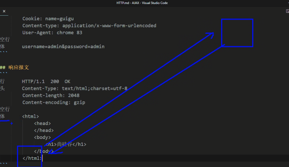 </body><script>//获取button元素const btn = document.getElementsByTagName('button')[0]const result = document.getElementById('result')//绑定事件btn.onclick = function(){//1.创建对象const xhr = new XMLHttpRequest();//2.初始化 设置请求方法和urlxhr.open('GET','http://127.0.0.1:8000/server?a=100&&b=200')//3.发送xhr.send()//4.事件绑定xhr.onreadystatechange = function(){if(xhr.readyState ===4 ){// if(xhr.status >=200 && xhr.status<300){// console.log(xhr.status)//状态码// console.log(xhr.statusText)//状态字符串// console.log(xhr.getResponseHeader())//所有响应头// }//设置result的文本result.innerHTML = xhr.response;}}}