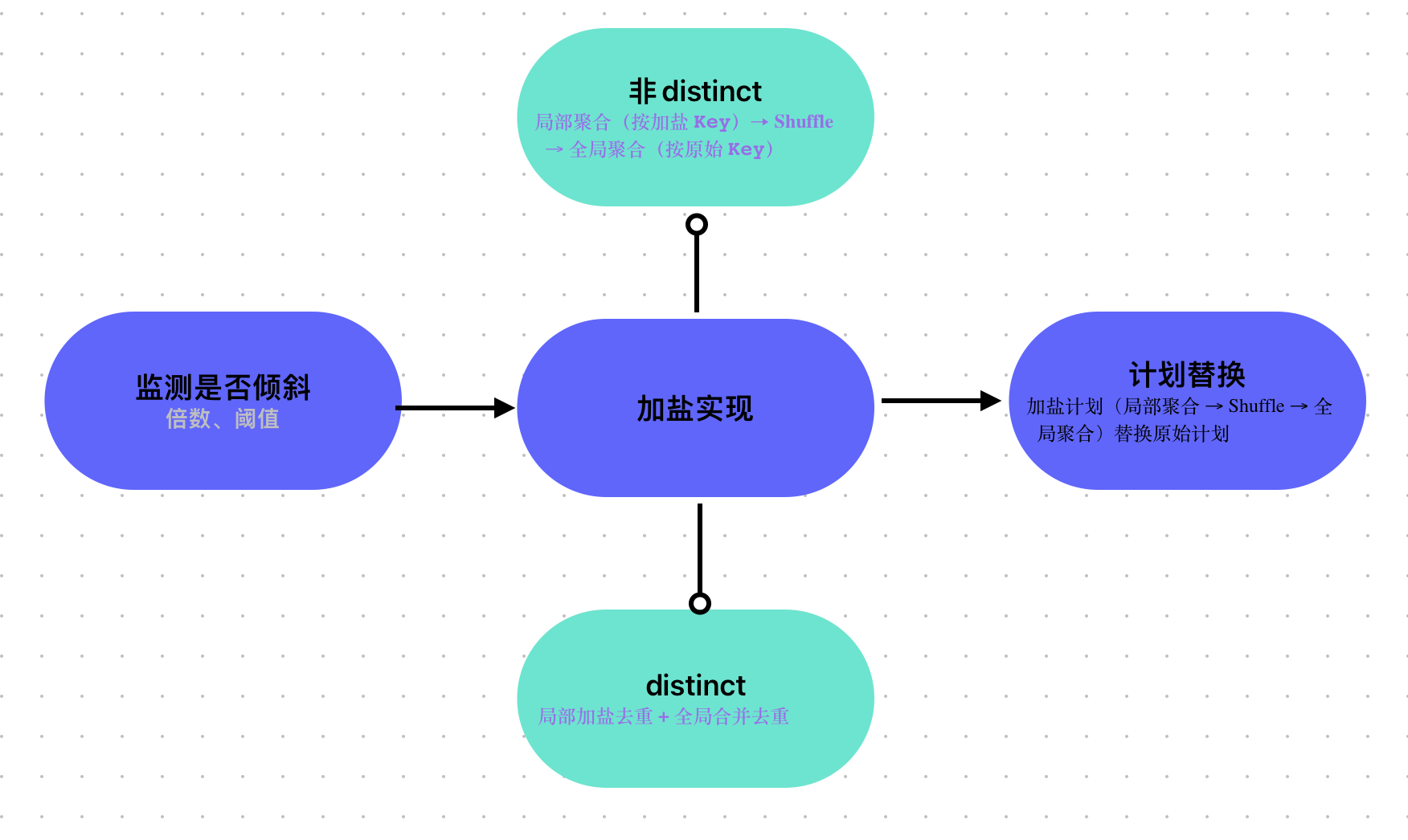AQE 计划调整 | org.apache.spark.sql.execution.adaptive.SkewJoinOptimizer | 运行时优化:针对 Join 倾斜触发加盐拆分;聚合倾斜需依赖 AggregateSkewOptimizer (部分版本需手动开启) |