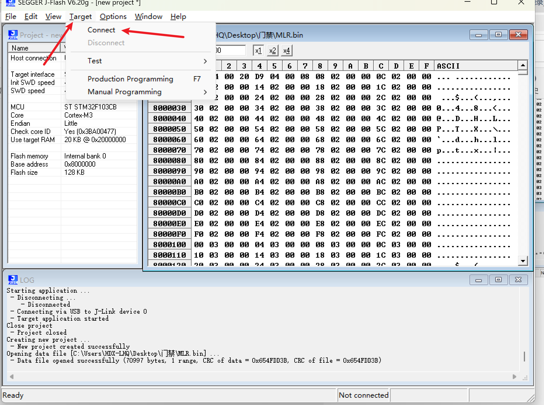 打开软件 先新建一个工程(才可以正常使用jlink下载程序) 选择需要的对应的芯片,然后点击ok➡️ok 可以看到工程信息 选择需要烧入的文件信息 1 2 3 点击链接看能不能链接设备 出现如下表示链接成功 下载程序 擦程序F4、写程序F6、重启启动F9,Target-Manual Programming-下分别可进行擦写程序和重启程序 设置烧入重启设备 烧入重启设备配置