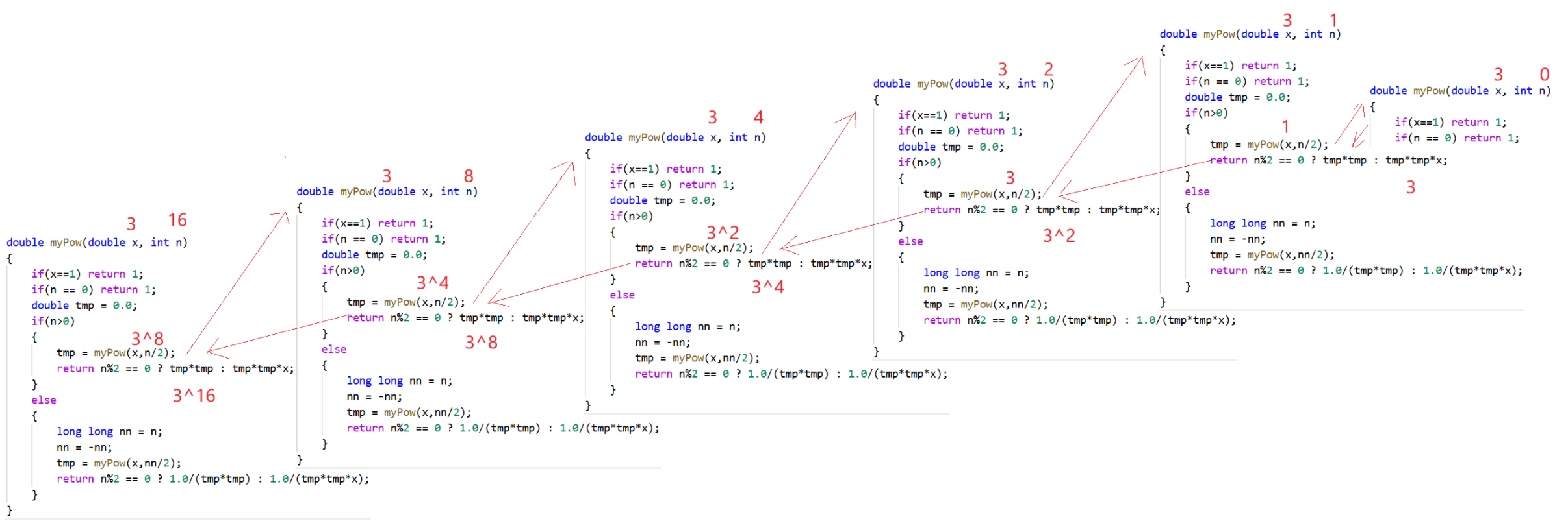 public:double myPow(double x, int n){if(x==1) return 1;if(n == 0) return 1;double tmp = 0.0;if(n>0){tmp = myPow(x,n/2);return n%2 == 0 ? tmp*tmp : tmp*tmp*x;}else{long long nn = n;nn = -nn;tmp = myPow(x,nn/2);return n%2 == 0 ? 1.0/(tmp*tmp) : 1.0/(tmp*tmp*x);}}